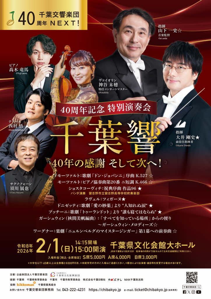千葉交響楽団 「40周年記念 特別演奏会―第九公演(第47回習志野第九演奏会)」に続き、来年2月1日(日)に≪40周年記念特別演奏会≫が催されます。